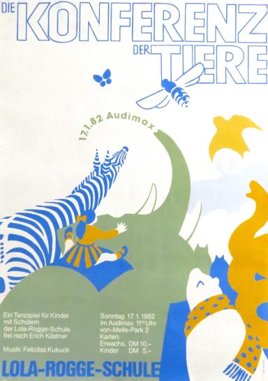 1982 „Die Konferenz der Tiere“ nach Erich Kästner wird als Kindertanzschauspiel zu Musik von Felicitas Kuckuck im Auditorium Maximum aufgeführt. Christiane Meyer-Rogge-Turner führt die Gesamtregie, Monika Weller assistiert.